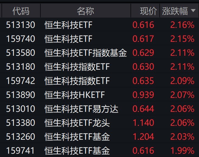 受盘面影响,恒生科技相关ETF普涨约2%。